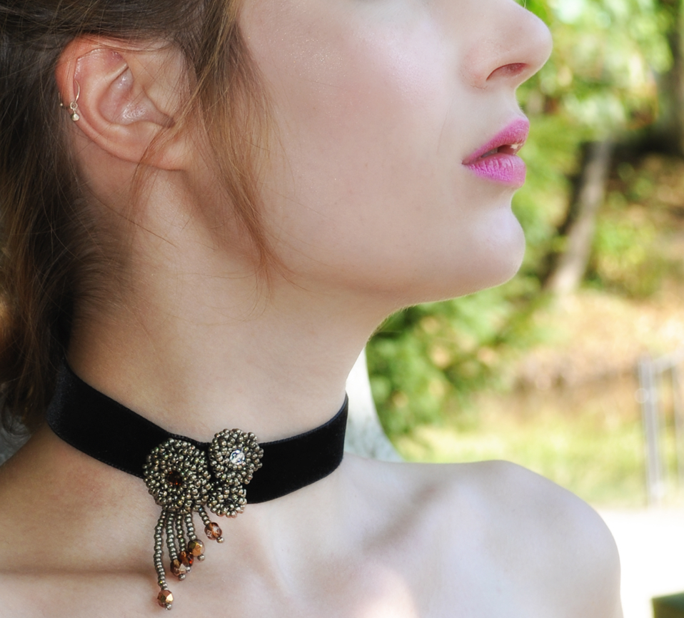 Anmutig-schwarzsamtiges Halsband, es kommt mit drei Rosetten in antiken Gold-Rocailles und Champagner-Kristallen daher.