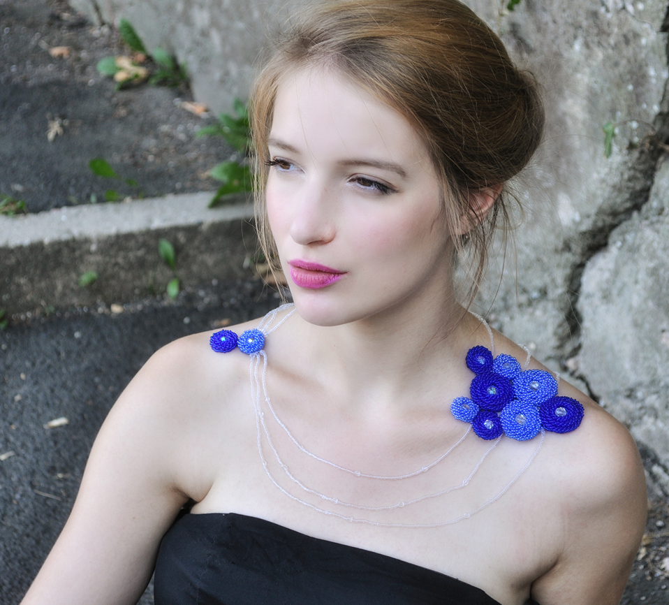 Ein sehr exklusiver Schulterschmuck in royal-blau und aquablauen Rocailles mit böhmischen Kristallen vollendet.